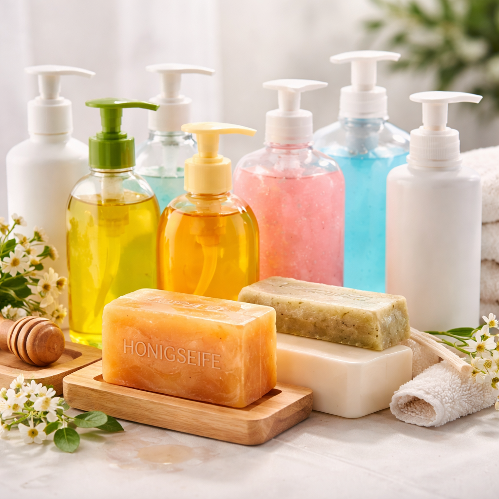 Das Sortiment umfasst sowohl klassische Flüssigseifen als auch feste Seifen, darunter auch pflegende Varianten wie Honigseifen auf natürlicher Basis. Diese verbinden effektive Reinigung mit hautfreundlichen Eigenschaften und sind ideal für den täglichen Gebrauch geeignet.
